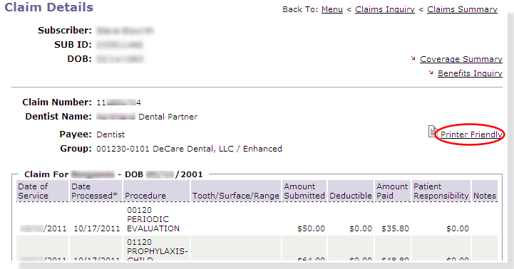 Click the Printer Friendly link (shown above) located just above the details table. A separate window with the claim details will appear. Click the Print button in this window, and use the Print dialog to print the page. Click the Close Window link to return to the Claim Details screen.
