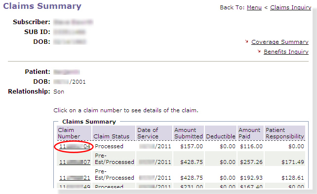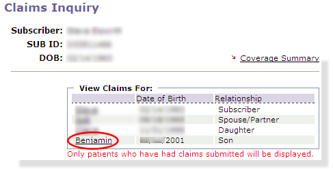 Note: You can also access the Claims Inquiry page by clicking the Claims Inquiry link found on the Coverage Summary page, as well as the Benefits Inquiry page.