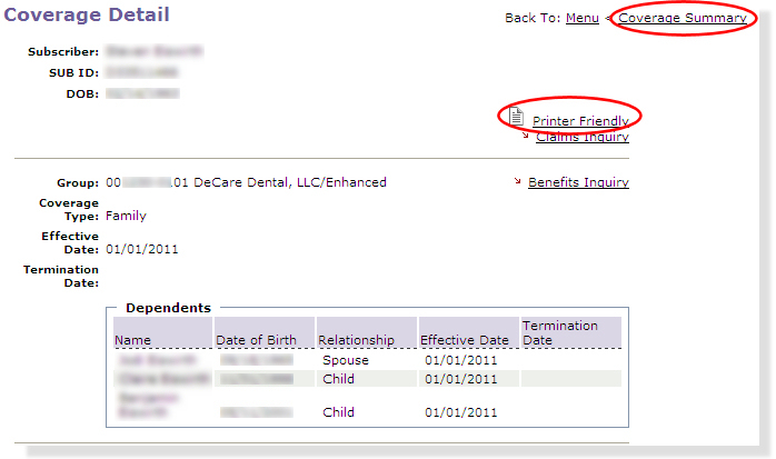 Click the Printer Friendly link, shown in the Coverage Detail example above. Your coverage detail will display in a separate window. Click the Print button in this window, and use the Print dialog to print the page.